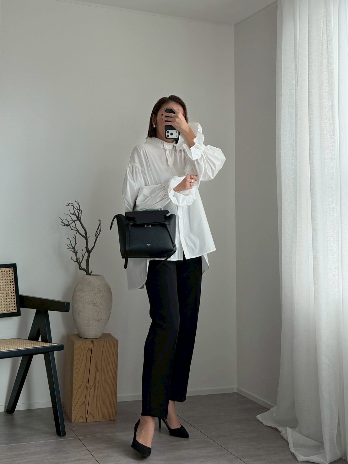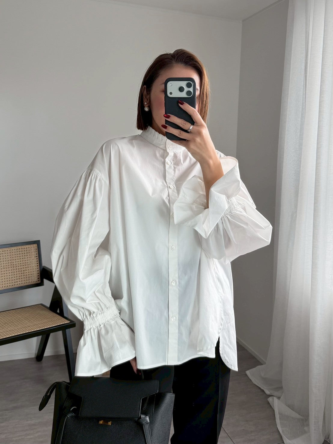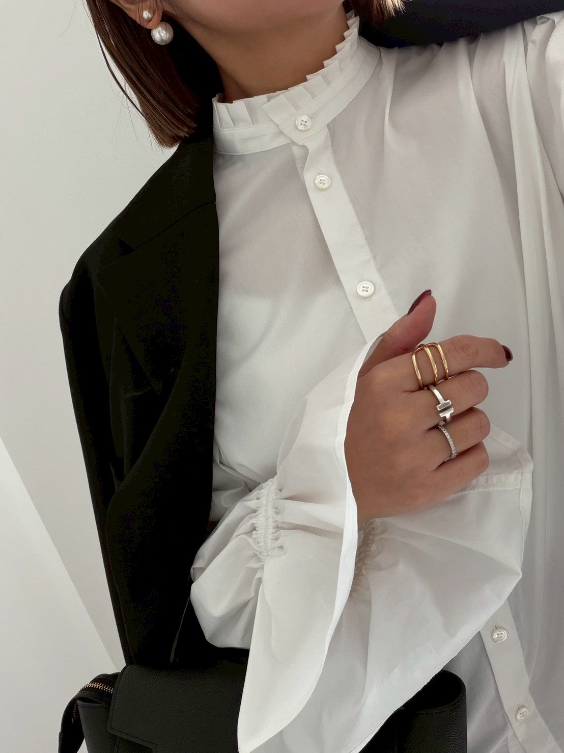 スタンドカラーボリュームスリーブブラウス