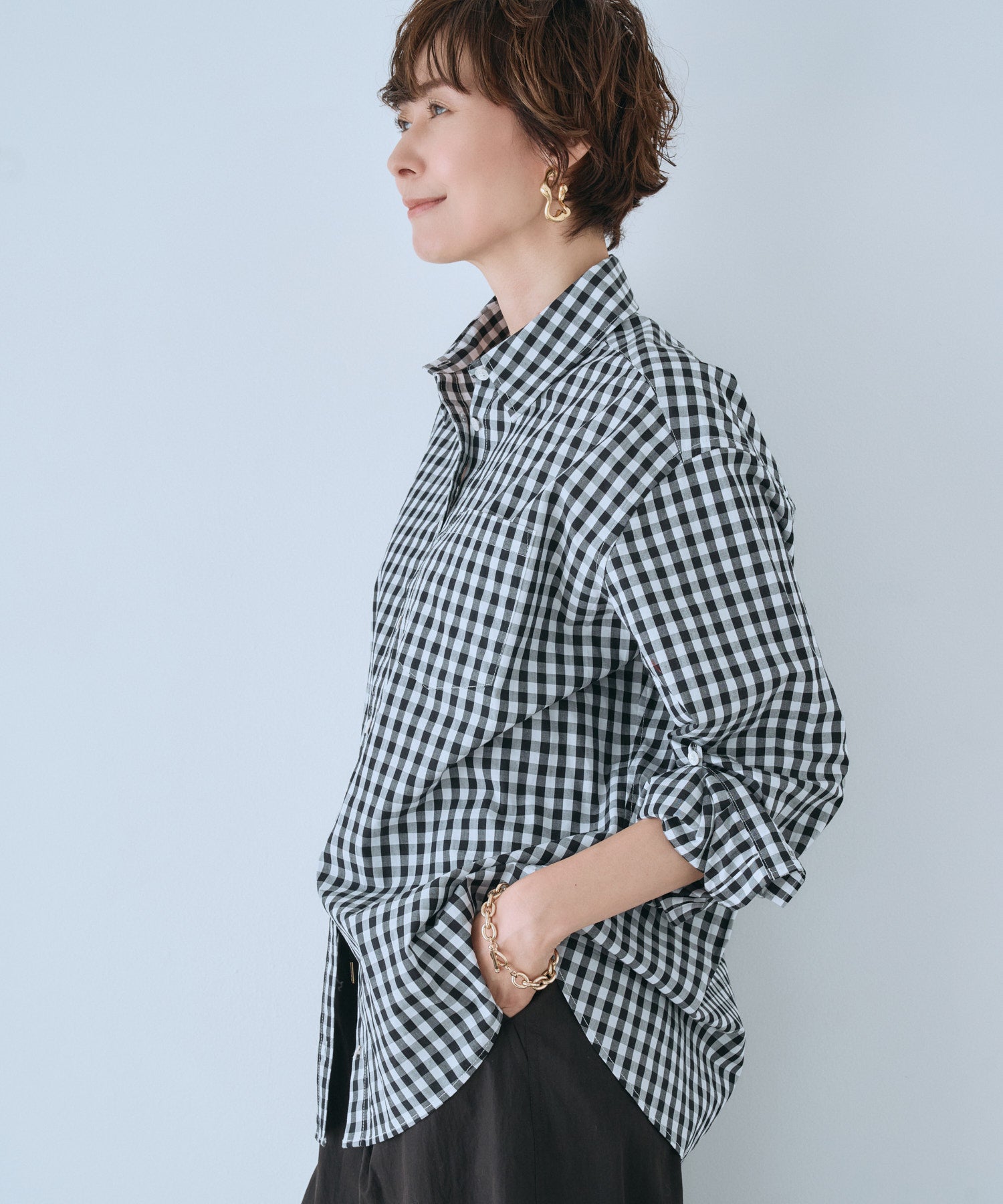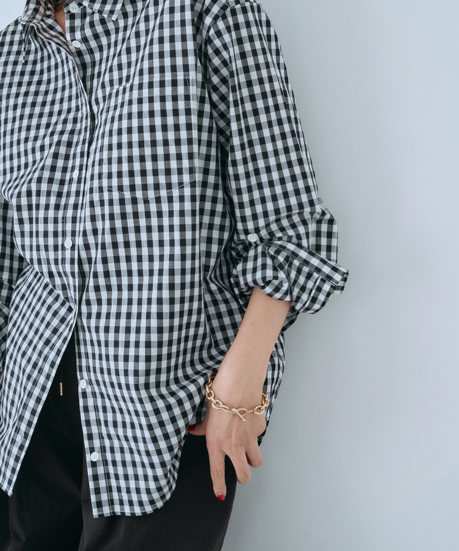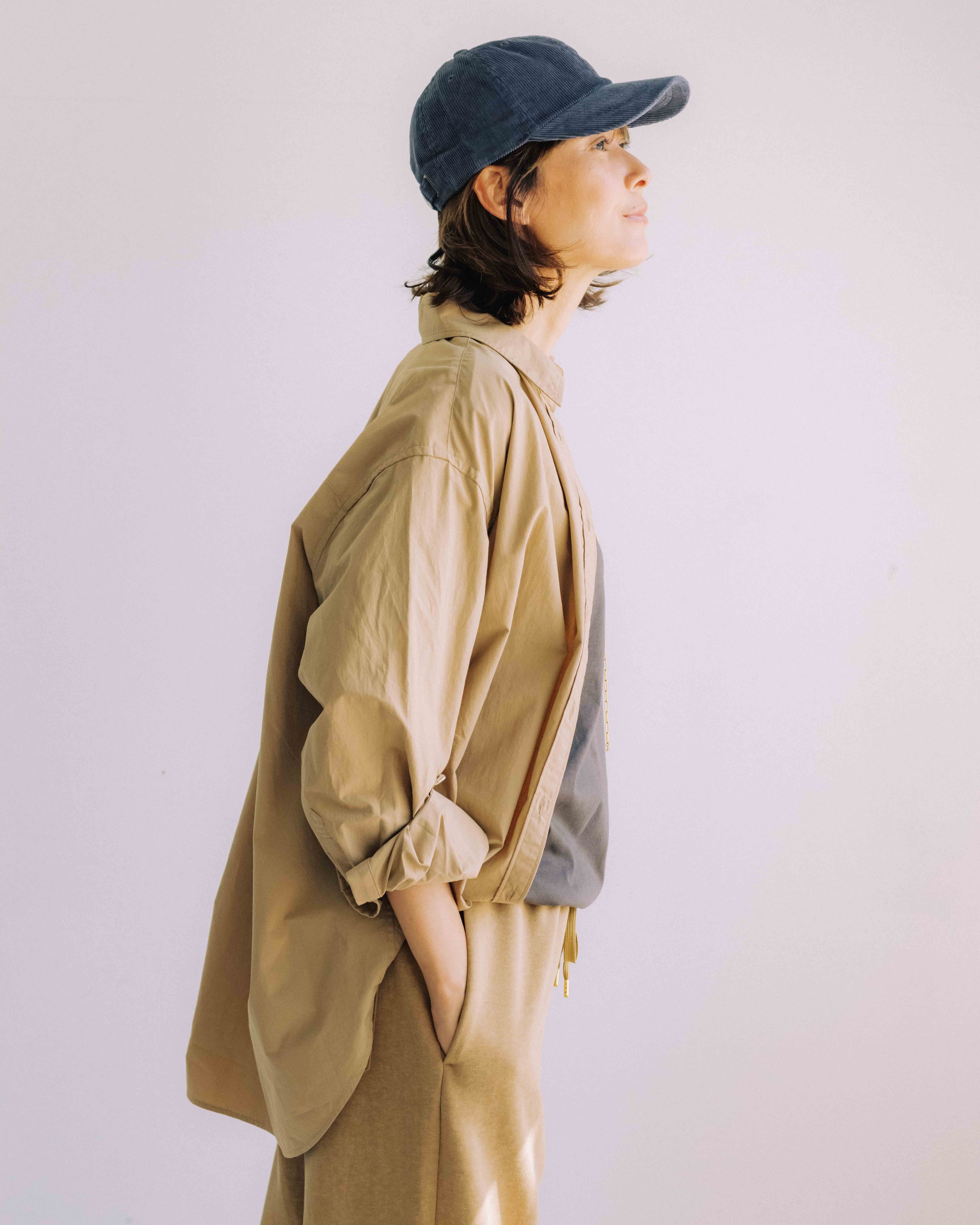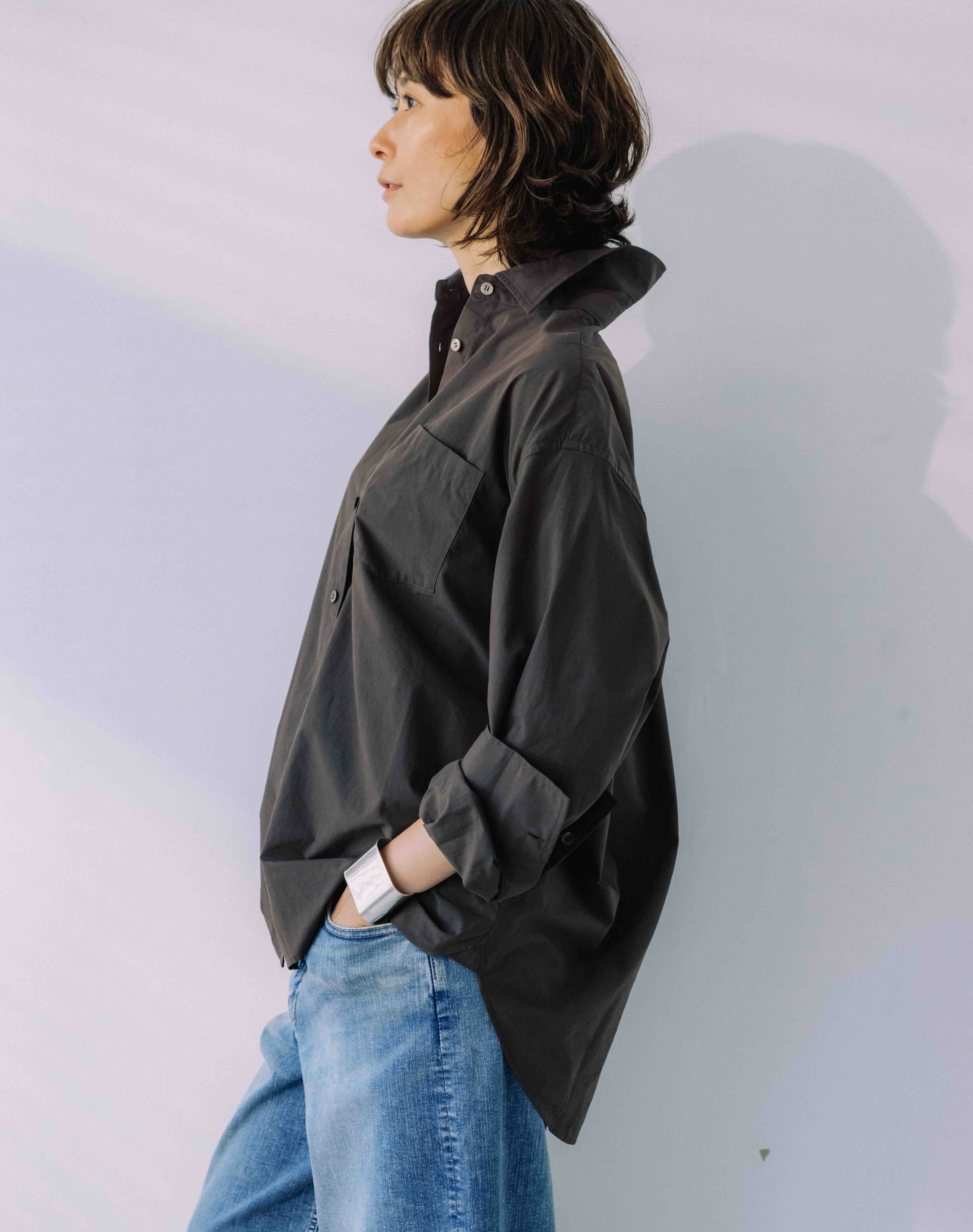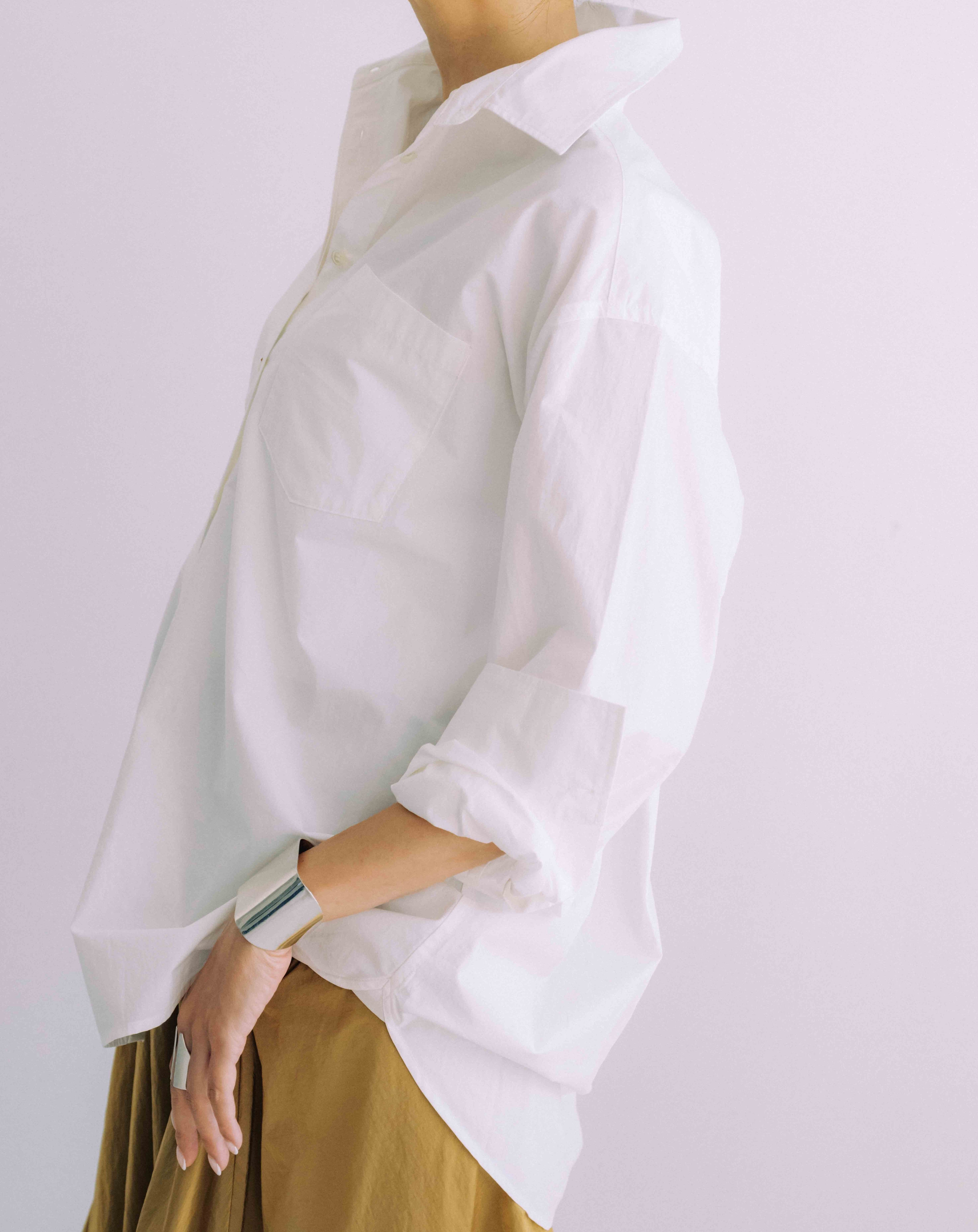 袖口にはループ付きデザインを採用し、袖をたくし上げた際にもスタイルを崩さず、さりげない機能性と洗練を両立。ベーシックでありながらモードな表情を備えた、大人のためのコットンシャツです。