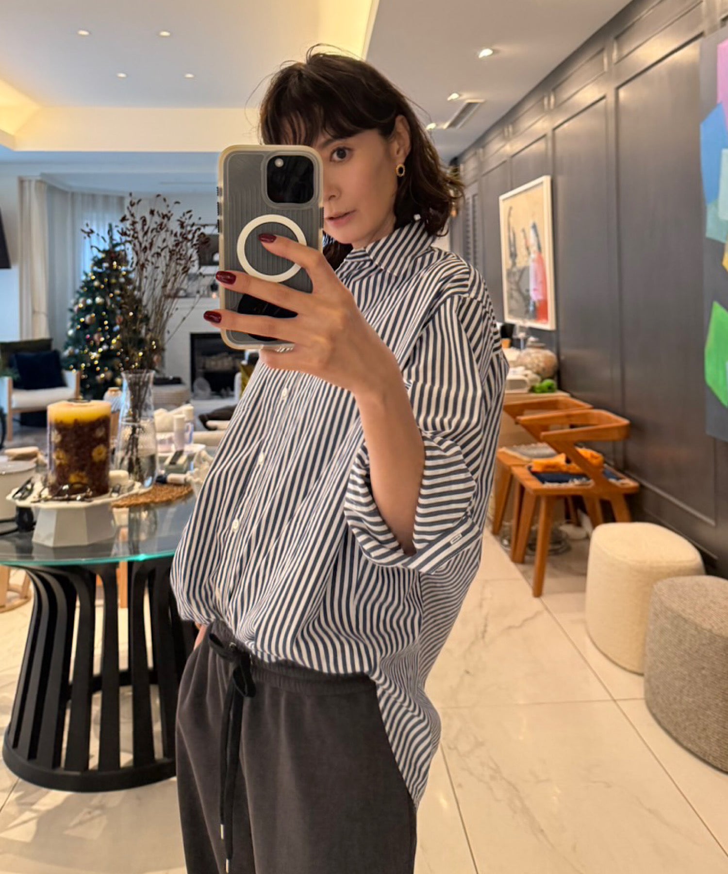 通気性に優れ、気温の高い季節は一枚で、秋冬にはニットやジャケットのインナーとしても活躍。シーズンを越えて楽しめるタイムレスな一着です。