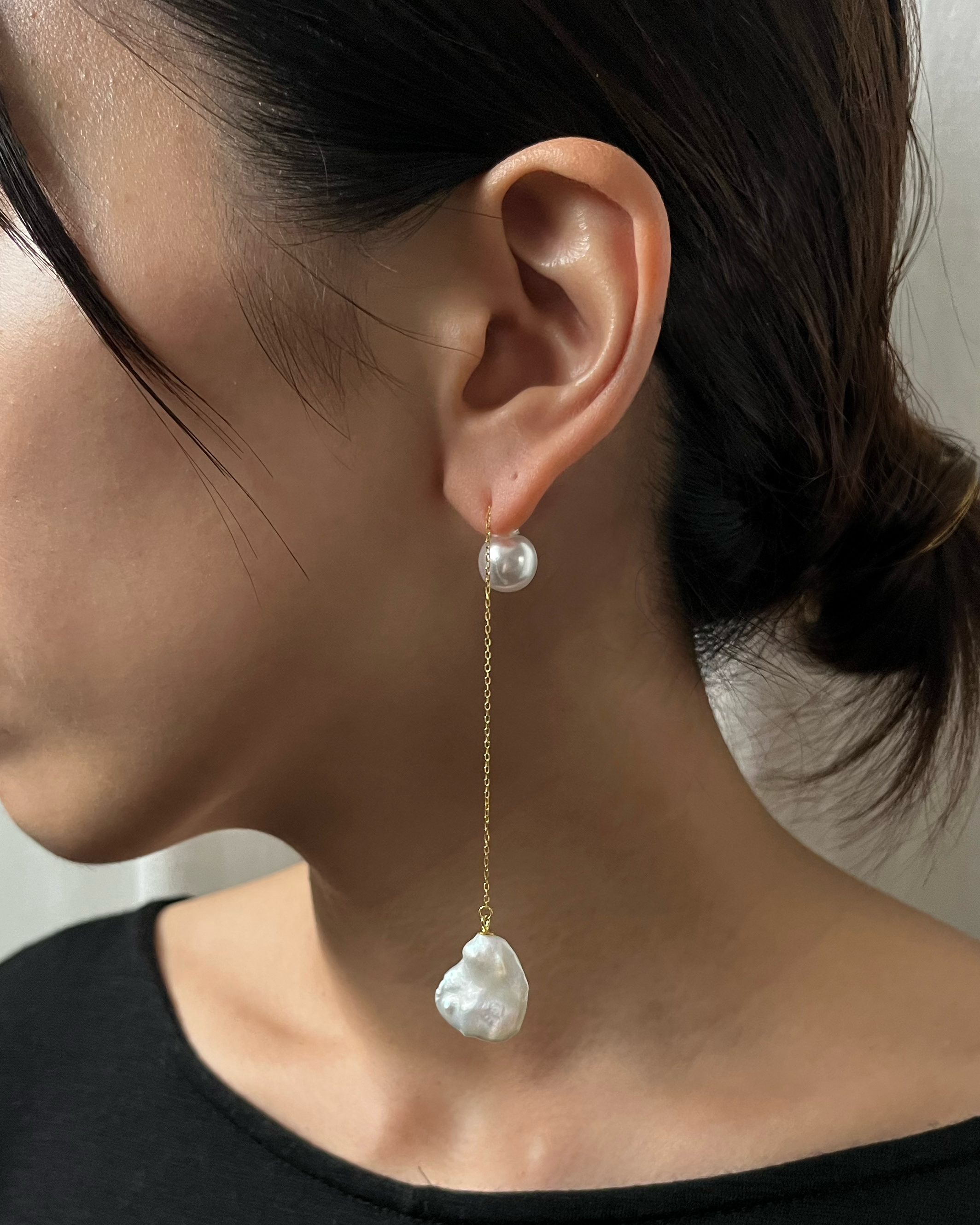 ひとつとして同じ形のない バロックパール を用いたスウィングピアス。自然の造形美をそのままに活かした有機的なフォルムが、耳元で揺れるたびに光を受けて豊かな表情を見せます。