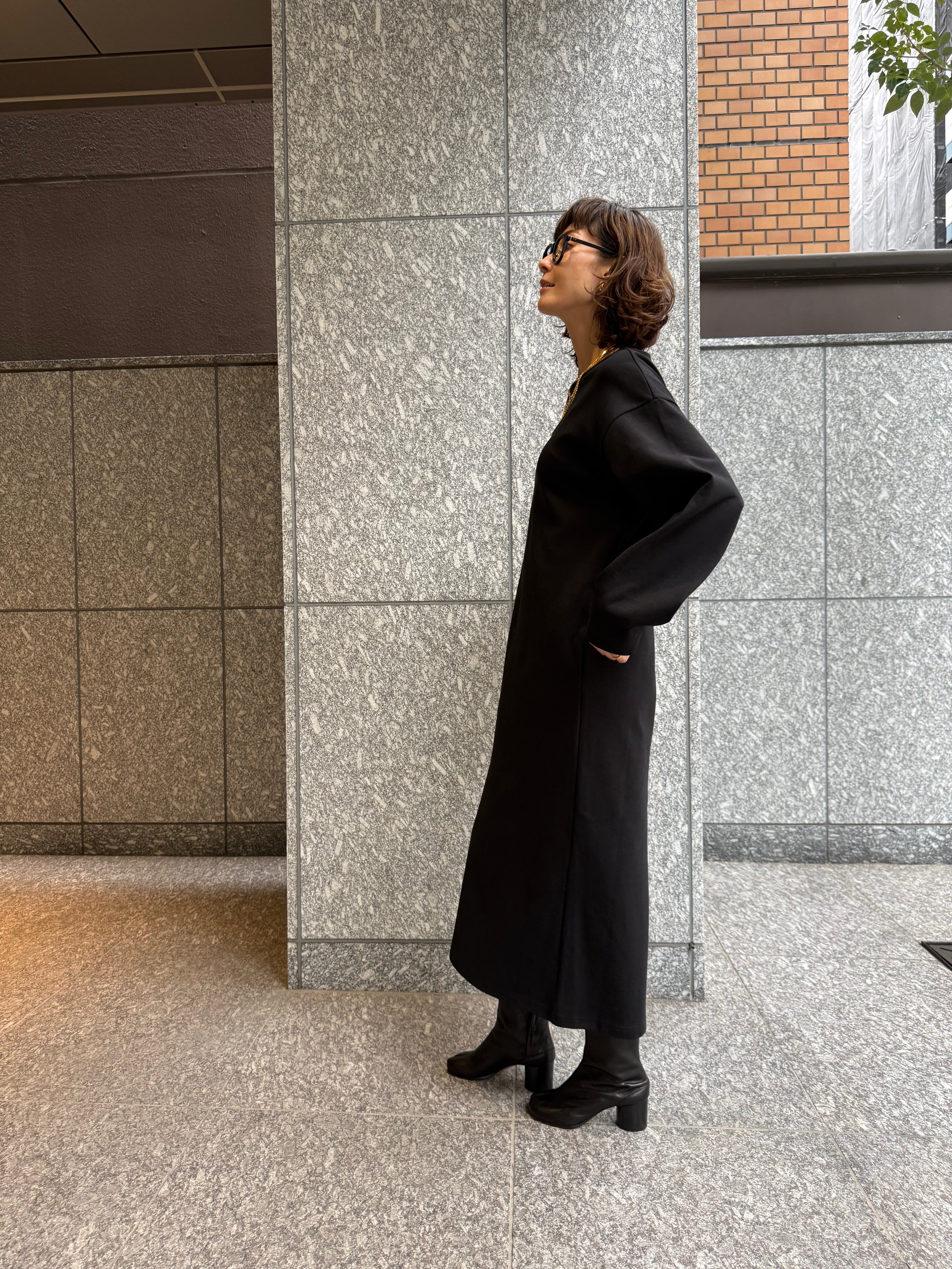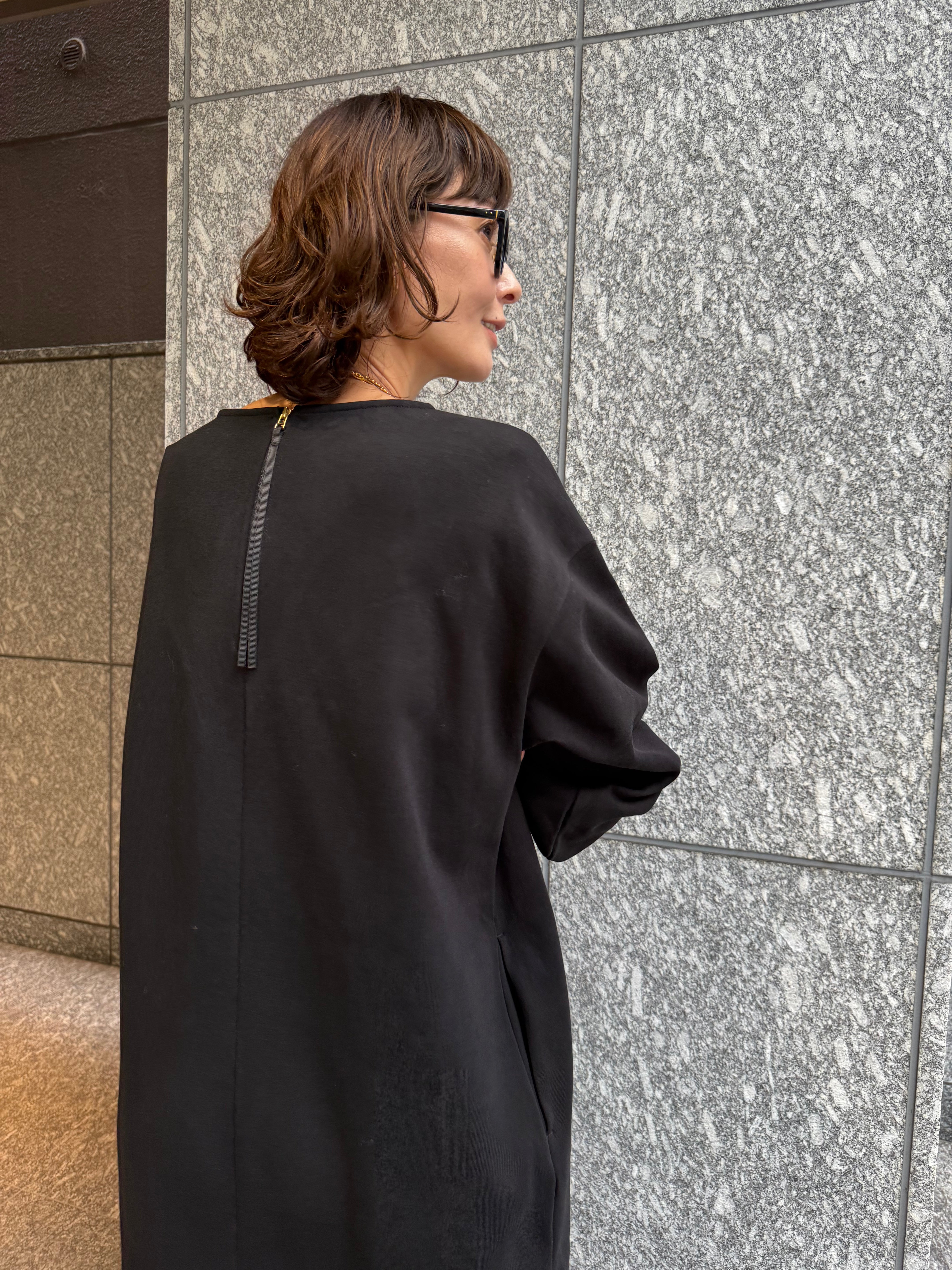 ゆるやかなフォルムながら、体のラインを拾いすぎず、すっきりとした印象に仕上げました。